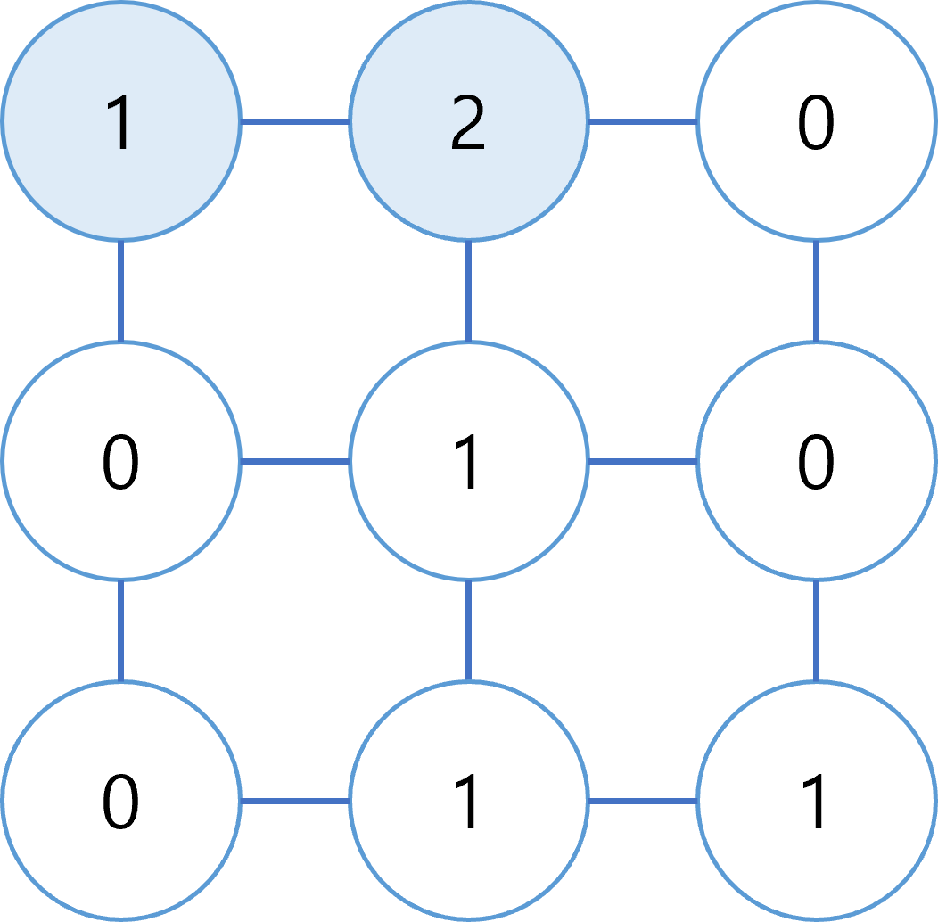 N x M 크기의 얼음 틀이 있다. 구멍이 뚫려 있는 부분은 0, 칸막이가 존재하는 부분은 1로 표시된다. 구멍이 뚫려 있는 부분끼리 상, 하, 좌, 우로 붙어 있는 경우 서로 연결되어 있는 것으로 간주한다. 이때 얼음 틀의 모양이 주어졌을 때 생성되는 총 아이스크림의 개수를 구하는 프로그램을 작성하시오. 다음의 4 x 5 얼음 틀 예시에서는 아이스크림이 총 3개 생성된다.