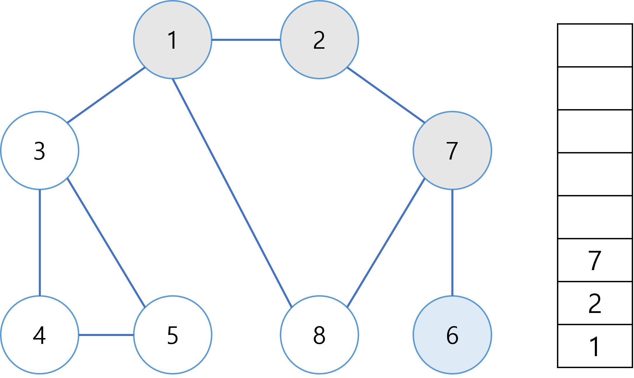 [Step 6] 스택의 최상단 노드인 '7'에 방문하지 않은 인접 노드 '8'이 있다.