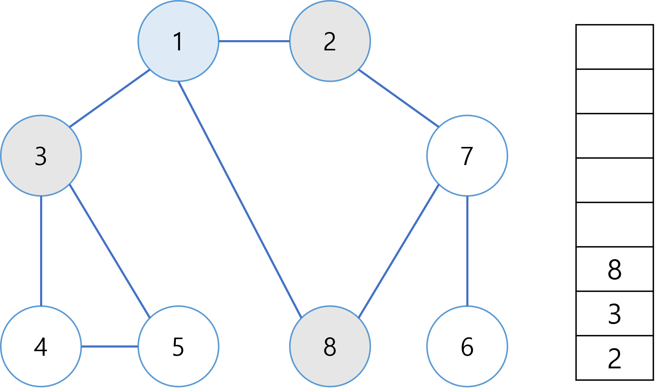 [Step 2] 스택의 최상단 노드인 '1'에 방문하지 않은 인접 노드 '2', '3', '8'이 있다.