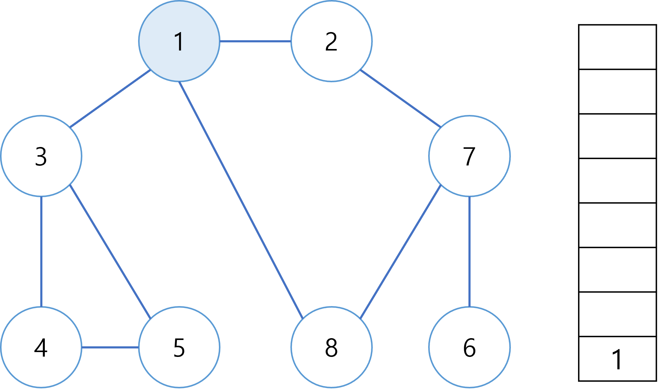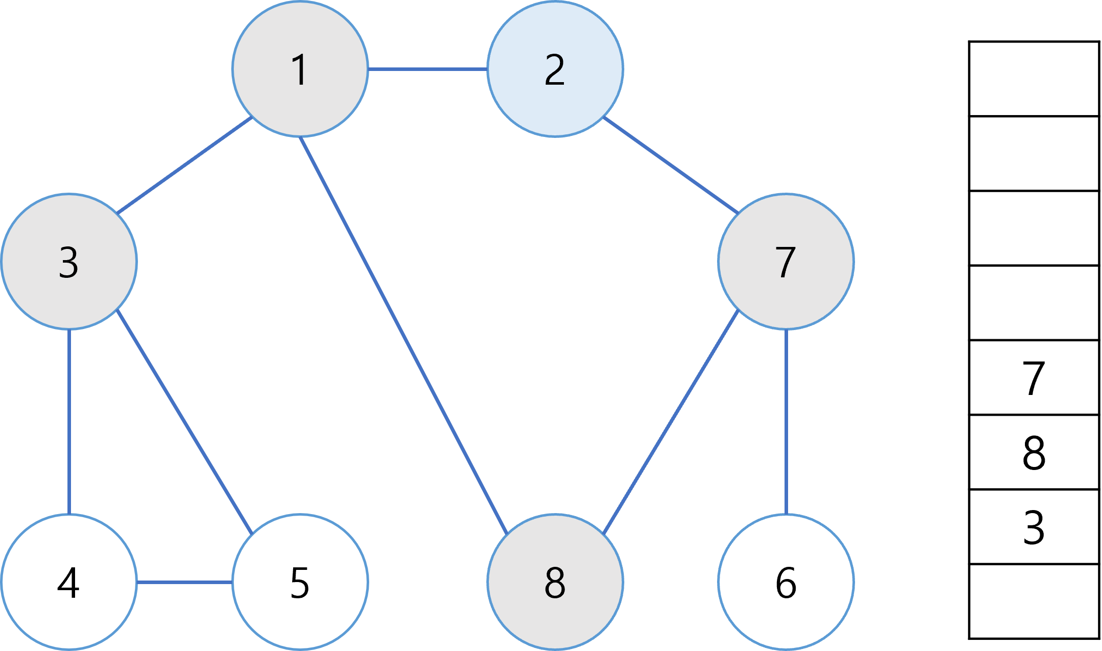 [Step 2] 큐에서 노드 '1'을 꺼내 방문하지 않은 인접 노드 '2', '3', '8'을 큐에 삽입하고 방문 처리한다.