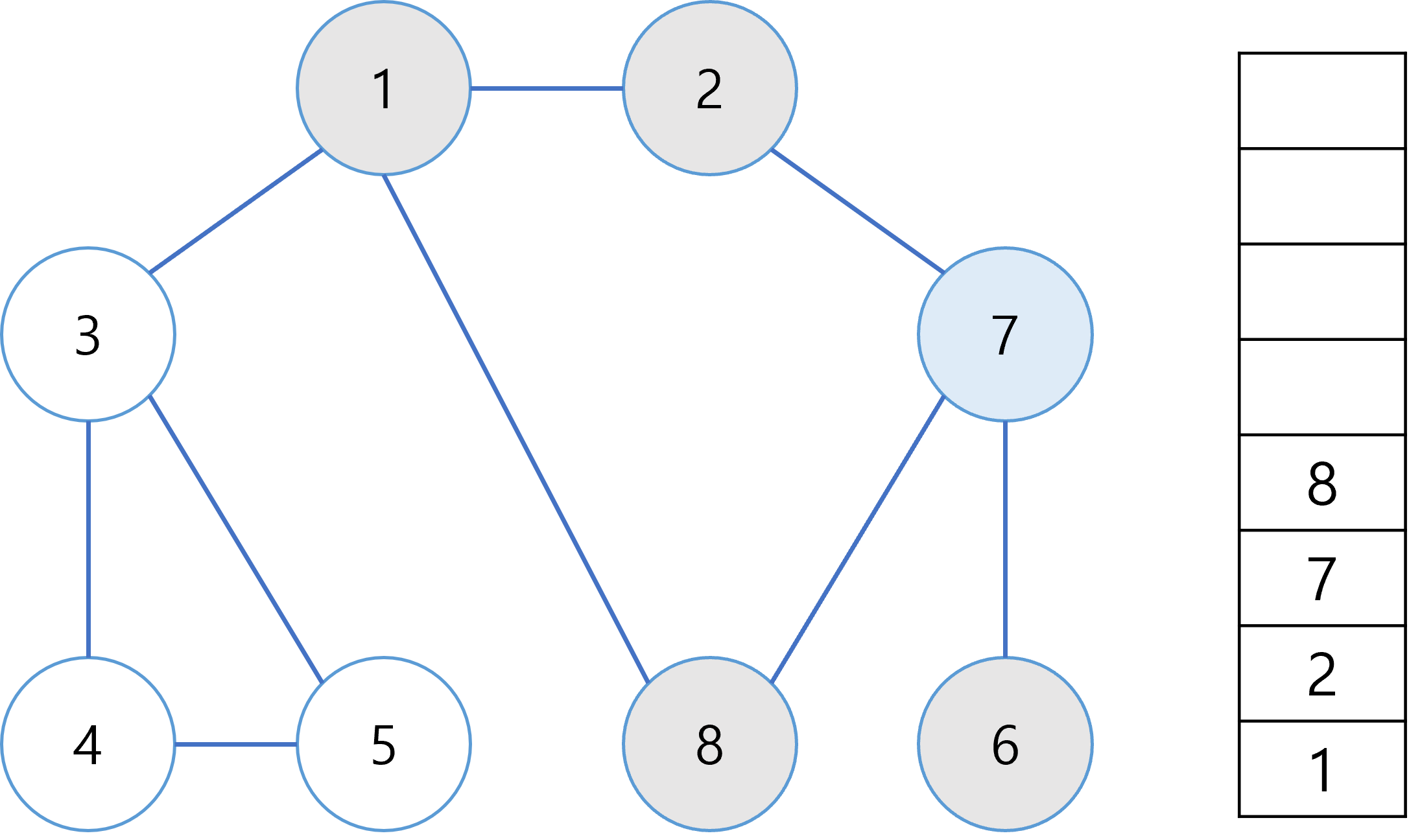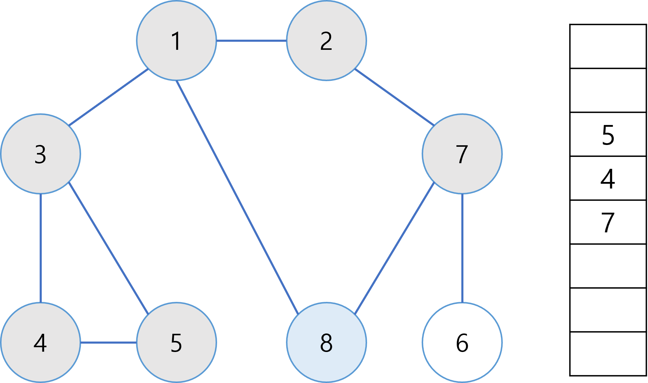 - 따라서 '8'번 노드를 스택에 넣고 방문 처리한다.
