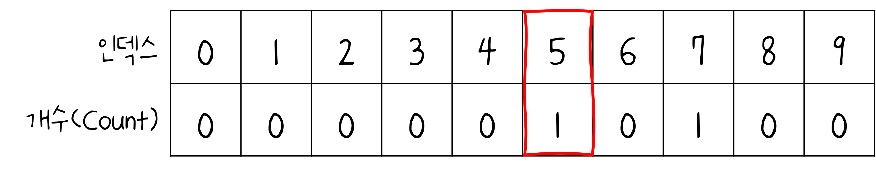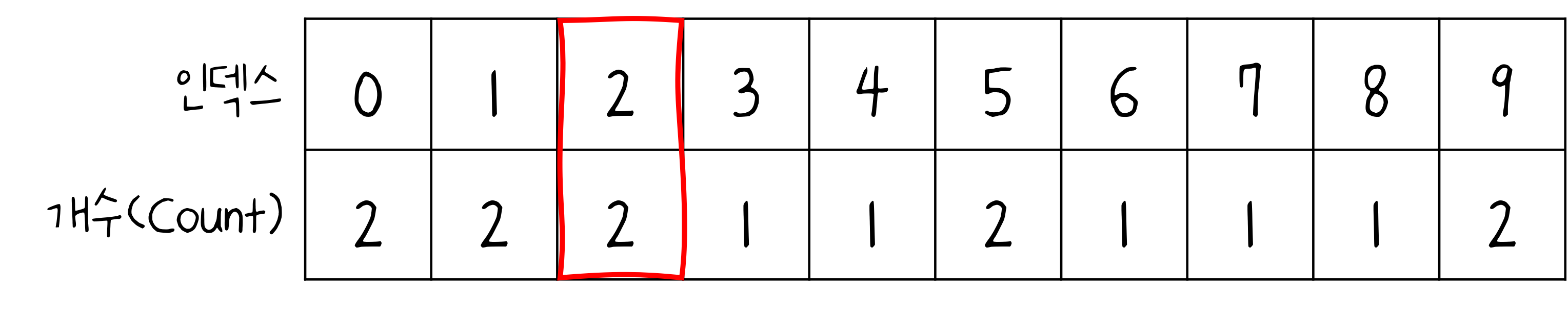 - 결과를 확인할 때는 배열의 첫 번째 데이터부터 하나씩 그 값만큼 반복하여 인덱스를 출력