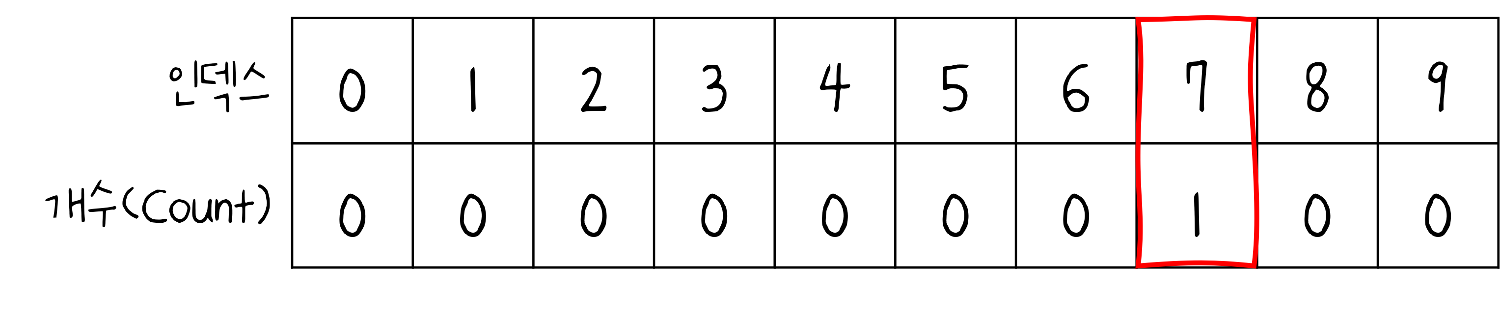 [Step 1] 데이터를 하나씩 확인하며 데이터의 값과 동일한 인덱스의 데이터를 1씩 증가시킴.