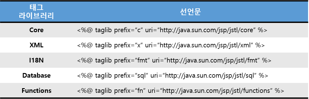 - JSP 표준 라이브러리로, JSP에서 자주 사용하는 기능을 미리 구현해 놓은 커스텀 태그 라이브러리 모음